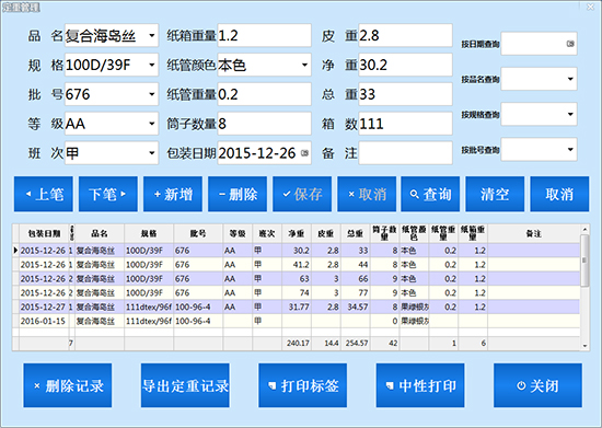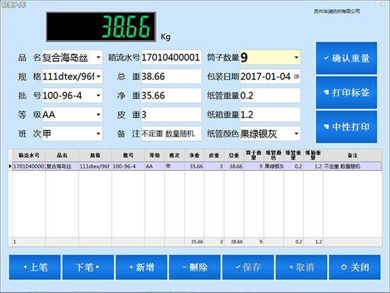 预装触摸版化纤丝称重管理系统,界面简洁,上手即会,无需培训。一键记录,一键打印装箱单标签,更有专用按键打印中性标签纸(无生产公司信息),按两次即可完成数据的记录和标签的打印工作。MZh范家瑜的个人主页